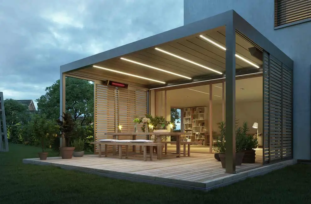 Für noch mehr Wohnkomfort können unsere Lamellendächer durch raffinierte Extras erweitert werden. Seitliche Schiebeelemente aus Glas, Aluminium oder Holz sorgen für einen lückenlosen Rundum-Schutz. Falls Sie es lieber luftig und schattig mögen, kann Ihr Lamellendach mit senkrechten Markisen ausgestattet werden. Integrierte Heizstrahler und LED-Leuchten lassen in den Abendstunden ein stimmungsvolles Ambiente aufkommen. Gönnen Sie sich behaglichen Luxus und schaffen Sie Ihre ganz eigene Wohlfühloase im heimischen Garten.